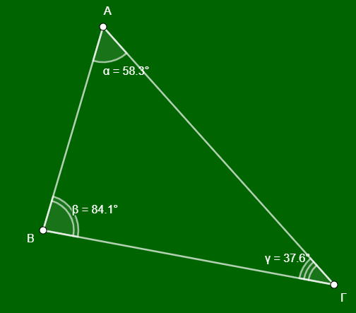 Άσκηση 7: Στο παρακάτω τρίγωνο να ονομάσεις \(\hatΑ\) τη γωνία που είναι απέναντι στη μεγαλύτερη πλευρά, \(\hatΒ\) τη γωνία που είναι απέναντι στη μικρότερη πλευρά και \(\hatΓ\) την τρίτη γωνία.