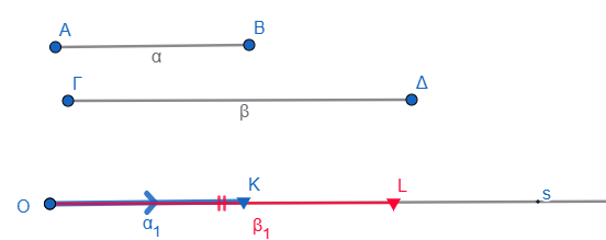 - Πρακτικά, χρησιμοποιώντας διαβήτη, σχεδιάζουμε μια ημιευθεία με αρχή \(O\) και μεταφέρουμε το τμήμα \(AB\) (ορίζοντας το \(OK = AB\)) και στη συνέχεια, με αρχή το \(K\), μεταφέρουμε το τμήμα \(\Gamma\Delta\) (ορίζοντας το \(KL = \Gamma\Delta\)). Το συνολικό τμήμα \(OL\) αποτελεί το γεωμετρικό άθροισμα (\(OL = AB + \Gamma\Delta\)).