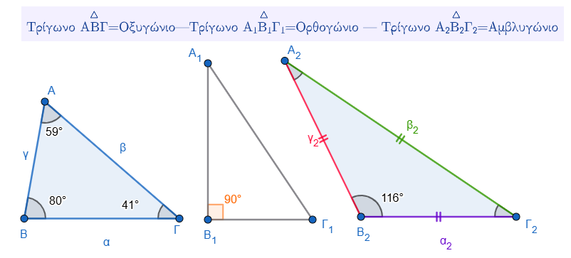 * Οξυγώνιο: Ονομάζεται το τρίγωνο του οποίου όλες οι γωνίες είναι οξείες, δηλαδή μικρότερες από 90°.