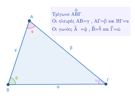 * Γωνίες: Είναι οι εσωτερικές γωνίες που σχηματίζονται από τις πλευρές του τριγώνου. Το άθροισμά τους είναι πάντοτε 180°.